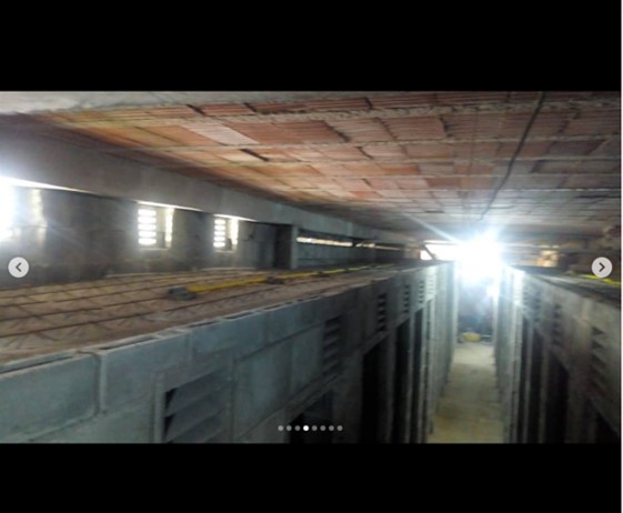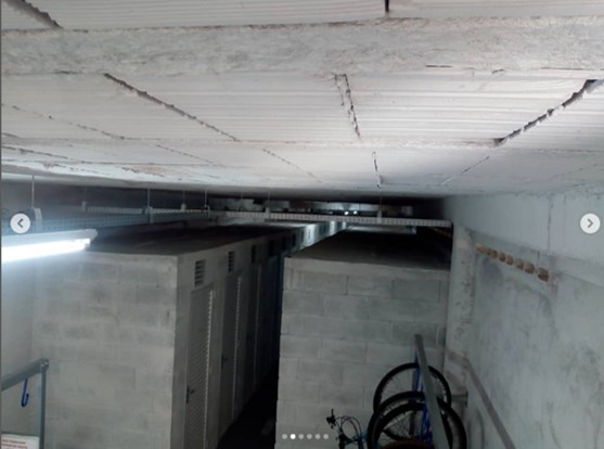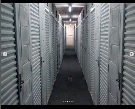 Boxes para depósito e espaço para bicicletário em área sob laje do estacionamento do condomínio.