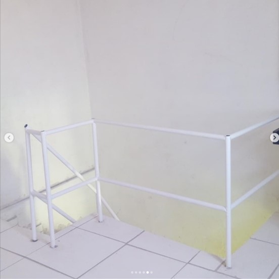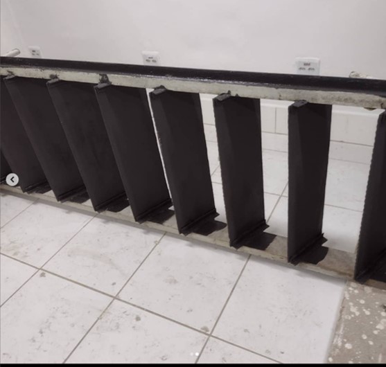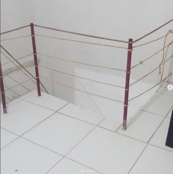 Após a colocação do revestimento cerâmico, fizemos um guarda corpo com cordas de sisal, apesar de “não seguro” serviu para delimitar o espaço, e dar um pouco de tranquilidade até agendar com a serralheria para confecção do definitivo. Tubos de 1 1/4 de aço carbono, pintado com esmalte sintético