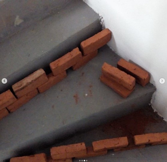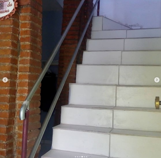 Remoção carpete, raspagem e aplicação de resina. Pintura, Regularização da escada, adequação e aumento da largura das pisadas. Colocação piso cerâmico 45×45.