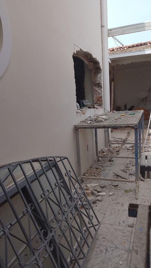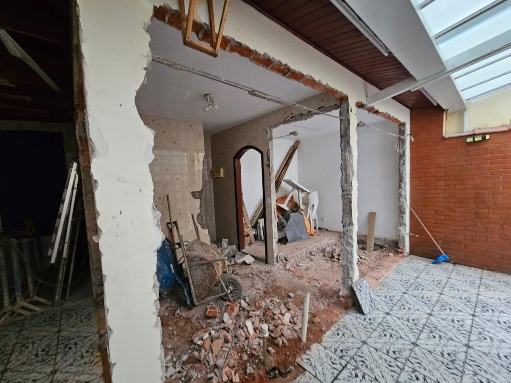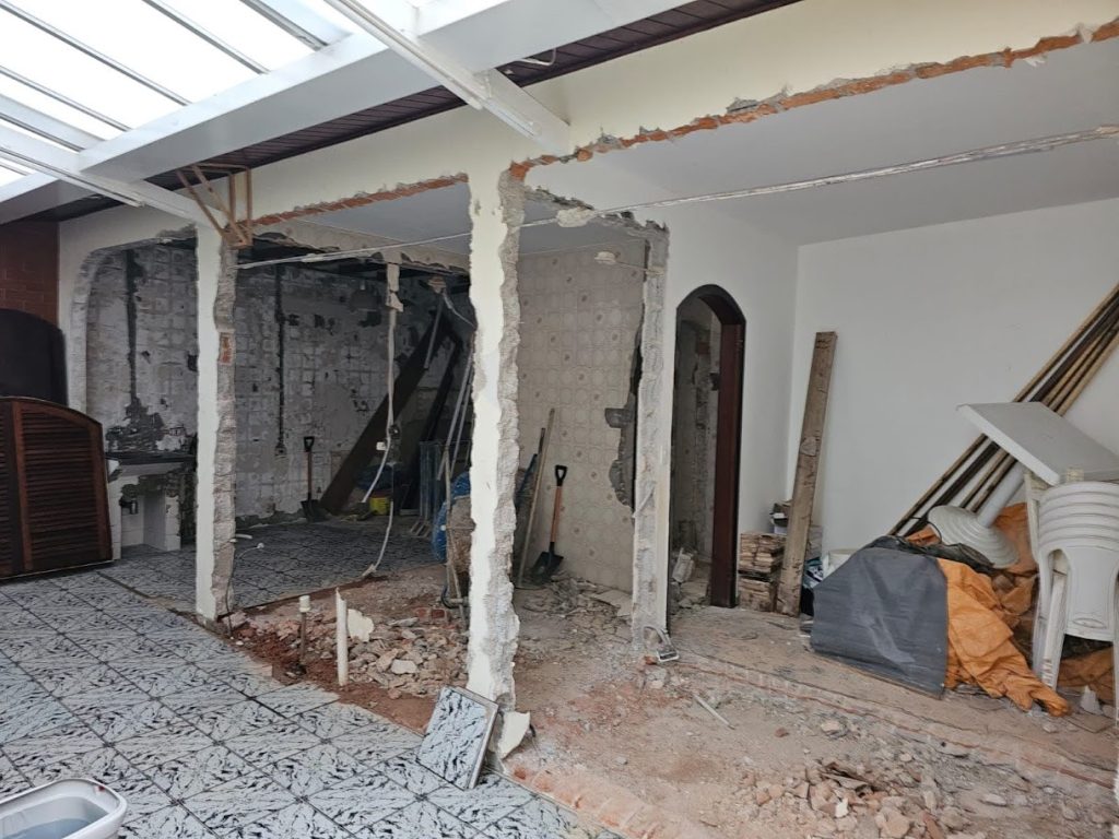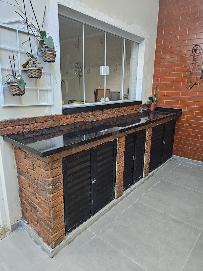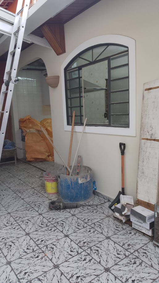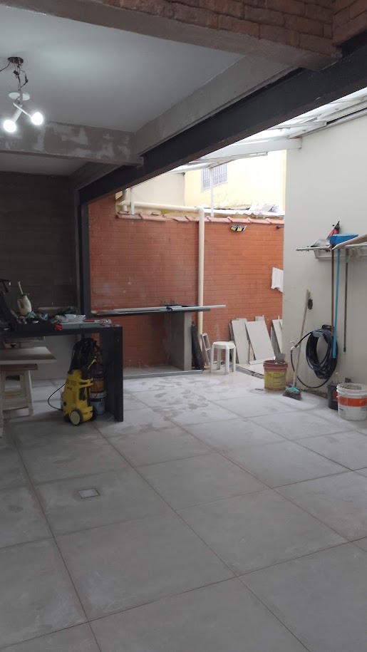Adequação da edicula para novo layout. área de churrasqueira, wc, deposito e lavanderia. Troca de telhado para metalica e telha pcv, Eletrica e hidraulica novas, revestimentos e viga metalica de 10m por toda a extensão da edicula.